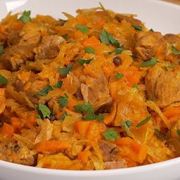 Прелесть этого блюда заключается в том, что для его приготовления вам понадобятся всего 4 ингредиента — свинина, квашеная капуста, морковь и репчатый лук. Благодаря томлению в духовке и кислоте квашеной капусты, кусочки мяса становятся нежными, а у капусты появляется особенный аромат.