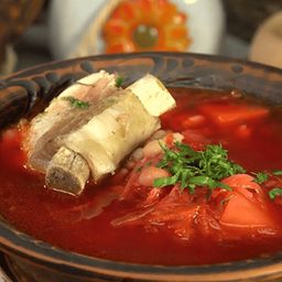 Самый красный, с крепким бульоном. Борщ на свиных ребрышках с дополнительными ингредиентами