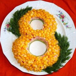 8 марта – это, прежде всего, цветы! Много цветов – розы, тюльпаны, мимоза. Это и следует брать за основу, придумывая праздничное оформление салатов на 8 марта.